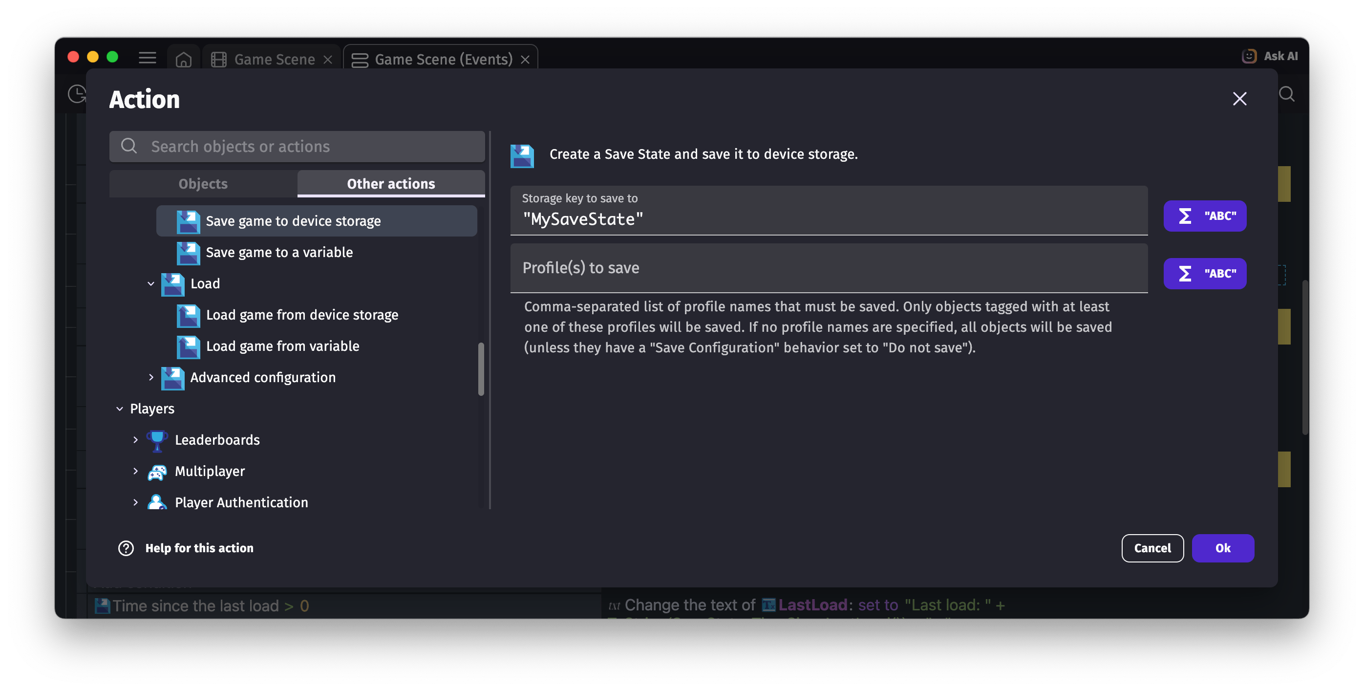 The load action also has an optional "Stop and restart all the scenes currently played" parameter. When enabled, all scenes are fully unloaded and re-created from the save state, which gives the cleanest restoration. When disabled (the default), existing scenes are updated in place — objects not present in the save are deleted and missing ones are re-created, but the scene is not restarted. For most games the default works well; enable it if you encounter odd state after loading.